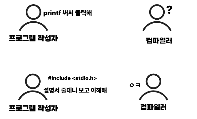쉽게 정리하면 #include <stdio.h>는 컴파일러에게 “이 기능 이렇게 쓰는 거다”라고 알려주는 설명서 정도로 생각하면 됩니다